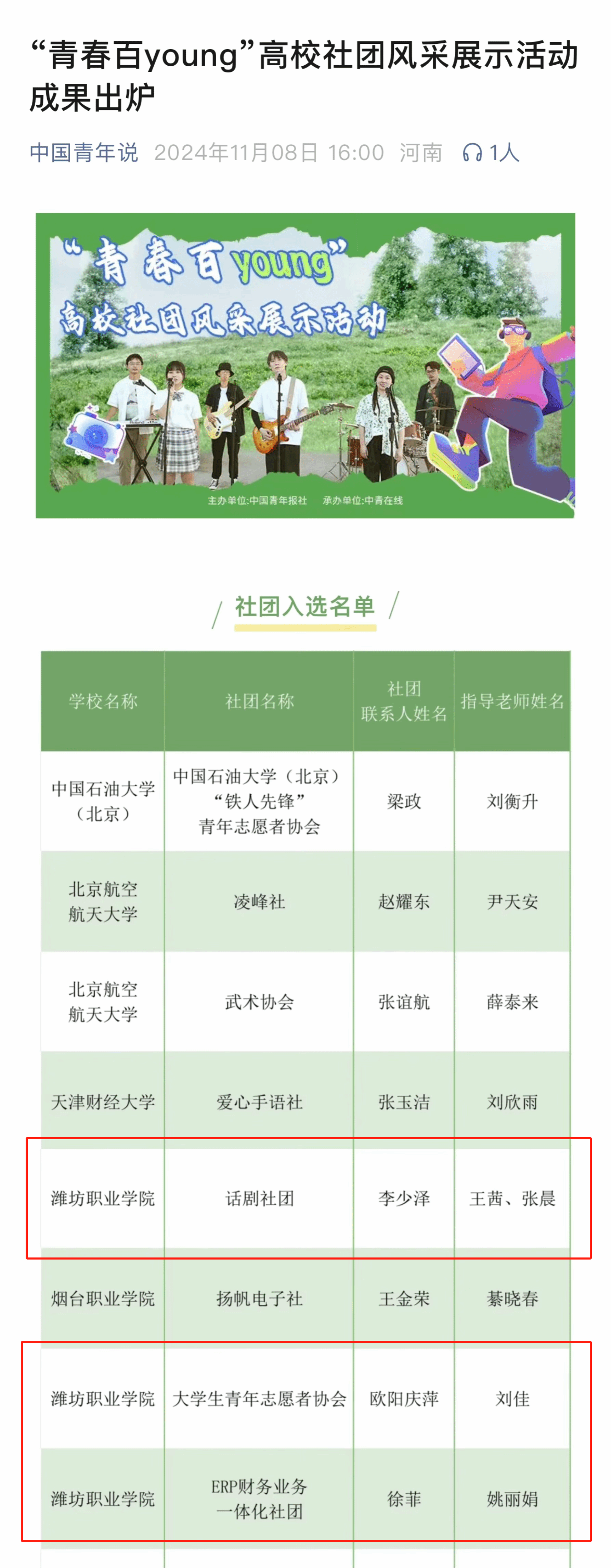 近日,由中国青年报社主办、中青在线承办的全国“青春百young”高校社团风采展示活动成绩公布,学院3个社团成功入选优秀社团。本次活动旨在呈现大学生多元的校园文化、展现当代青年昂扬的青春风貌,以青春视角展示高校学生社团活动开展实际和事迹成果。自9月活动启动以来,学院团委积极响应,鼓励各学生社团凝练社团特色、挖掘工作亮点、总结育人成效,按照活动要求提交作品。经过校内推荐、中国青年报宣传展示、专家评审团评审等环节,...更多 -