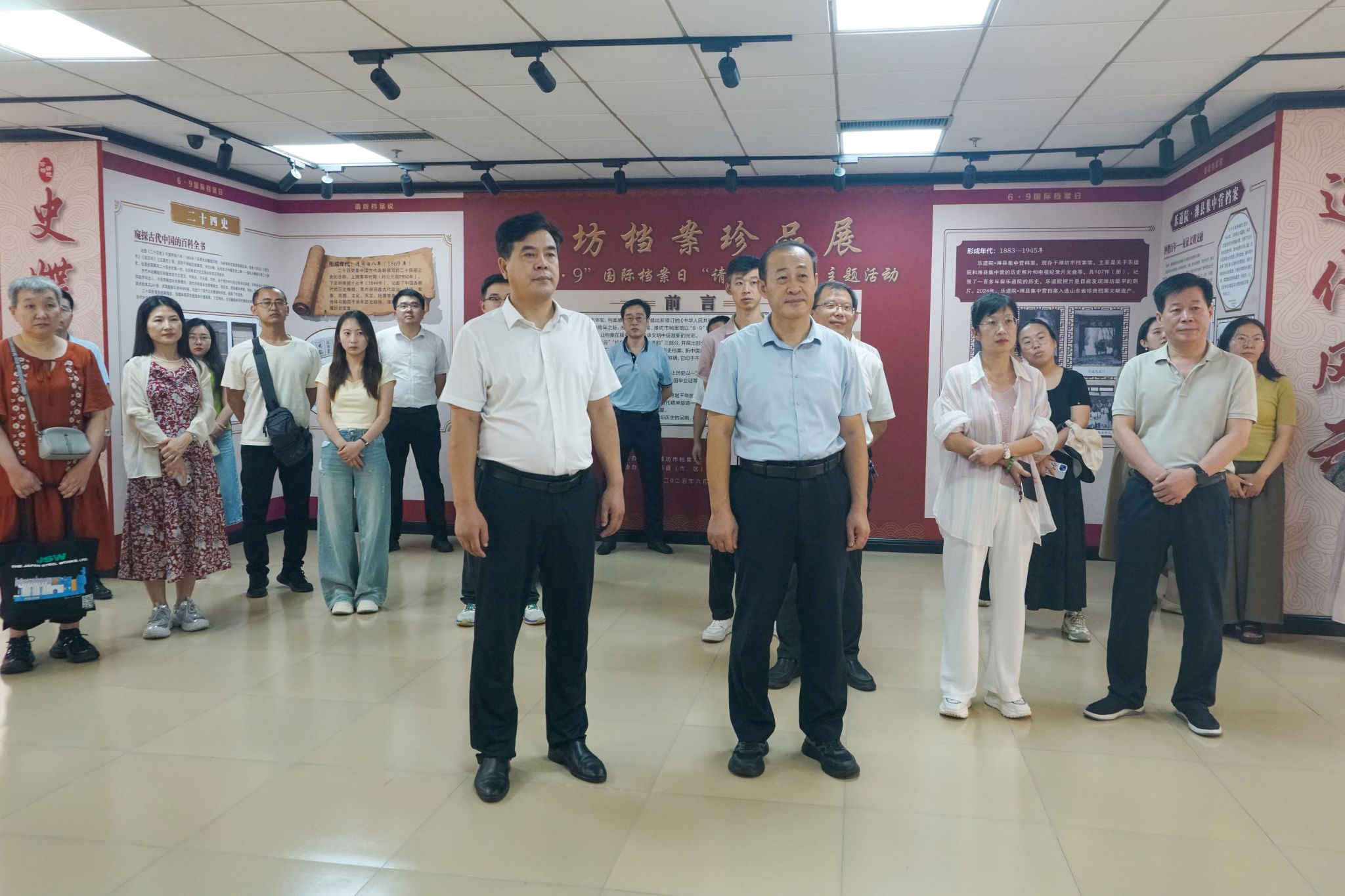 8月28日下午,学院党委委员、副院长赵宏坤带队到市档案馆参观潍坊档案珍品展。市档案馆馆长李晓华、副馆长华德军 等热情接待学院参观团并作重点宣讲。学院档案馆负责同志和各部门兼职档案员及办公室党支部党员50余人参加活动。档案珍品展分为“史牒遗韵”“红色印记”“近代风云”三个板块。通过《二十四史》《潍县志》《莱州府志》等珍贵典籍和潍县战役战地照片、昌潍人民支援边疆建设及百年胶济铁路潍坊段等图文档案,老师们重温了潍坊历史,...更多 -