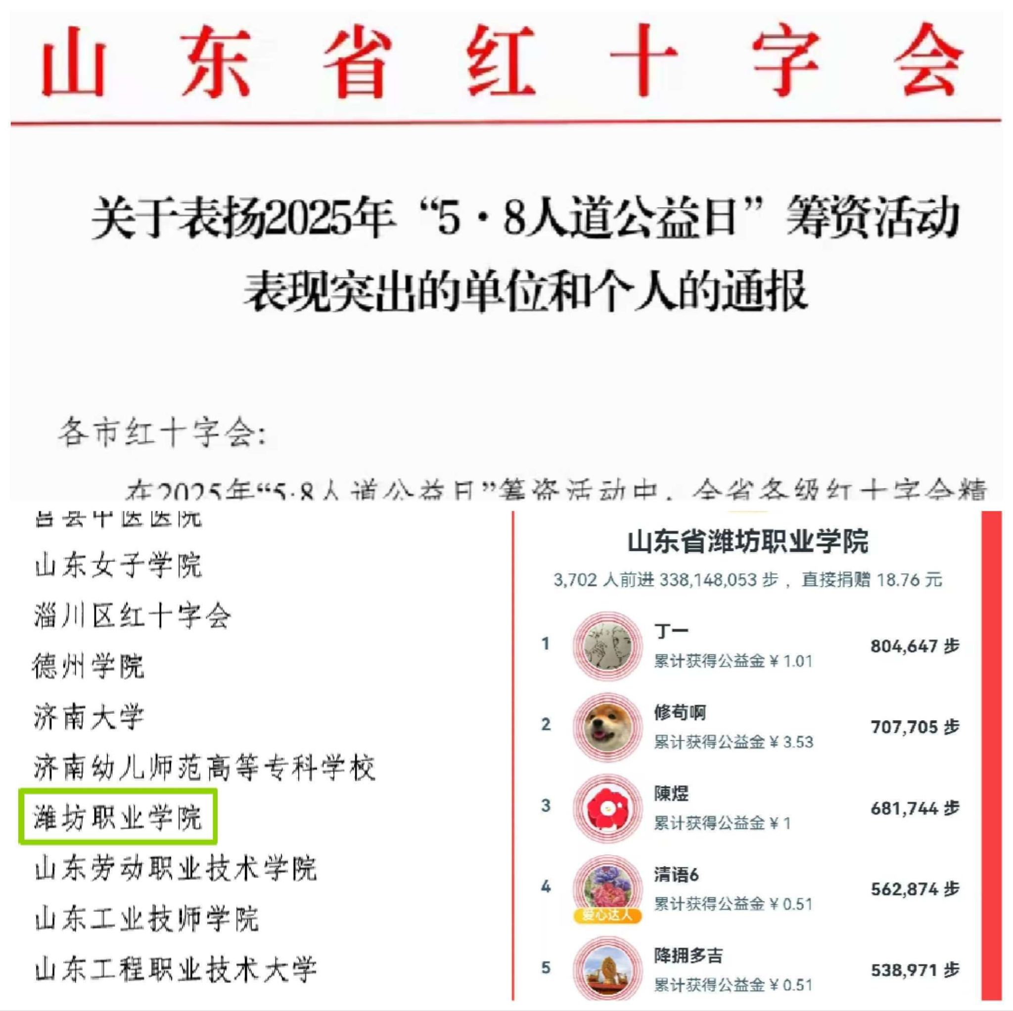近日,山东省红十字会发布《关于表扬2025年“5·8人道公益日”筹资活动表现突出的单位和个人的通报》,我院被选为2025年“一块走”捐步活动表现突出单位。在2025年“5·8人道公益日”筹资活动中,我院积极响应潍坊市和山东省红十字会有关要求,大力弘扬“人道、博爱、奉献”的红十字精神,组建开云(中国)“一块走”小队,组织发动广大师生参与“一块走”捐步公益活动。学院3702名师生积极行动,前进3.38亿步,捐步排名进入全国百强(...更多 -