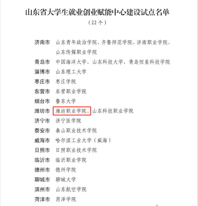 5月6日,《山东省人力资源和社会保障厅、山东省教育厅、山东省财政厅关于公布山东省大学生就业创业赋能中心建设试点名单的通知》正式发布,首批试点名单共有来自全省16地市22所高等院校,我院入选山东省大学生就业创业赋能中心建设试点,这是学院就业创业工作的又一省级标志性成果。 山东省大学生就业创业赋能中心旨在推动构建“覆盖高校、贯穿全程、精准高效”的大学生就业服务新格局,提升新时代大学生就业服务水平,实现就业工作质量和学生就业能力双提升、...更多 -
