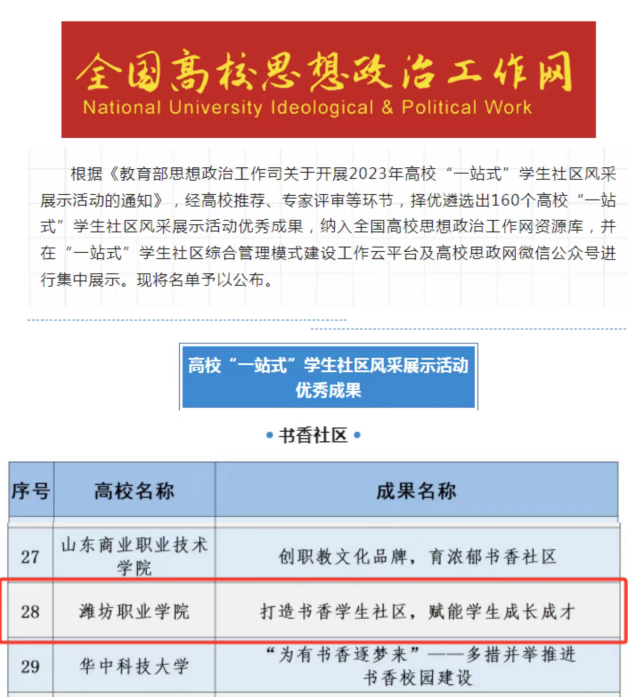 近日,由教育部思政司举办的2023年高校“一站式”学生社区风采展示活动优秀成果入选名单揭晓,经高校推荐、专家评审等环节,我院报送的《打造书香学生社区,赋能学生成长成才》成功入选风采展示活动“书香社区”模块优秀案例。该案例将被纳入全国高校思想政治工作网资源库,并在“一站式”学生社区综合管理模式建设工作云平台及高校思政网微信公众号进行集中展示。 此次展示活动由教育部思想政治工作司主办,旨在学习贯彻党的二十大精神和2023年全国两会精神,...更多