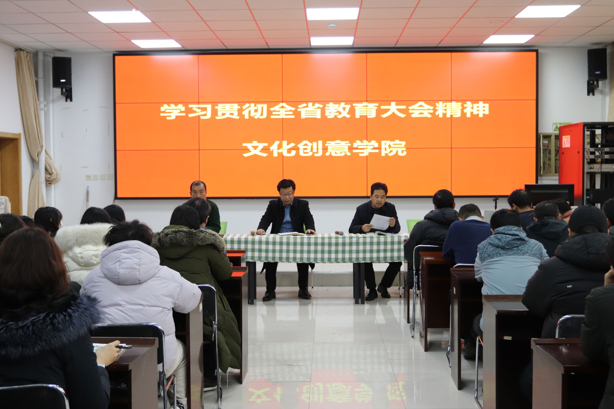 12月10日下午,文化创意学院组织全体教师在奎文校区16号楼523会议室学习全省教育大会精神,部署贯彻落实工作。文化创意学院党总支负责同志首先向教师们传达了山东省委书记林武在全省教育大会上的重要讲话,深度剖析了全省教育大会会议精神,并提出要提高政治站位、勇担使命、主动作为,争做有强烈责任感和使命感的教师。文化创意学院主要负责同志结合实际工作,从规范化管理、提高教学质量、做好技能大赛备赛工作等方面提出具体要求,...更多 -