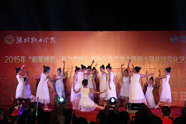 迎新晚会在《团结就是力量》和《强军战歌》大合唱中开场。晚会分成“爱国情”、“青春志”、“潍职梦”三大主题板块。《我爱你中国》、《不能忘却的纪念》等爱国主义类节目表达了潍职人的爱国豪情;街舞《Rock in wei zhi》、健美操《bang bang bang》、乐队表演、小品和歌曲串烧等社团类节目,充分展现潍职学子的青春活力、健康与自信;师生同台演出的《让我们舞起来》、《名校建设硕果多》、《戏曲表演》和《如果有来生》等节目,充分展现我院和睦相亲的师生关系和师生良好的精神风貌,特别是我院自入选山东省首批名校建设工程以来取得的建设发展成就;歌舞《异国风情民族歌舞》的表演者是来自学院国际教育学院的留学生,整个表演充满了异域风情,令现场观众耳目一新;粤语歌曲《海阔天空》在演唱时得到观众数次欢呼与掌声,台下的观众们不约而同拿出手机打开闪光灯参加现场互动,将整场晚会推向高潮。最后,晚会在男女二重唱《阳光路上》的歌声中结束,预示我院师生将在改革创新发展的新征程中,奋发向上,放飞梦想。