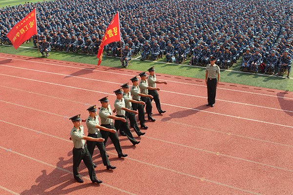 军训教官代表余旭、教师代表张建奎和新生代表丁云斐分别作了发言。随后教官们带来了精彩的军事科目示范表演,赢得全体人员雷鸣般的掌声。