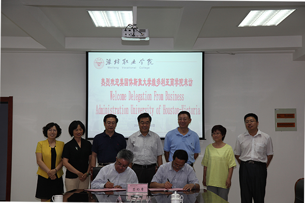 座谈会上,陈仁杰对Farhang Niroomand院长一行来访表示热烈欢迎,向客人介绍了潍坊的概况,并重点介绍了我院名校建设、自主招生、专业设置及国际交流合作等情况。Farhang Niroomand院长感谢学院的盛情接待,介绍了休斯敦大学的校区设置、维多利亚分校情况、办学理念、师生规模及学科设置等情况。经过座谈交流,双方在校际互访、师生交流、特别是在实质性合作办学项目的拓展等方面进行了深入探讨,达成了初步合作意向。会谈结束后,副院长赵君堂和Farhang Niroomand院长代表双方学校签署了友好合作备忘录。