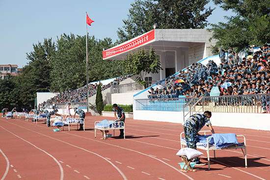 军训内务主要包括整理床铺、按规定放置物品等项目,比赛分8组,共有72名2014级新生参加比赛。比赛现场紧张有序、气氛热烈,选手们铺垫、展褥、平整床单、叠被,摆放毛巾、脸盆、马扎等物品,动作娴熟,以优异的比赛成绩对军训期间的内务学习作了一次完美汇报。