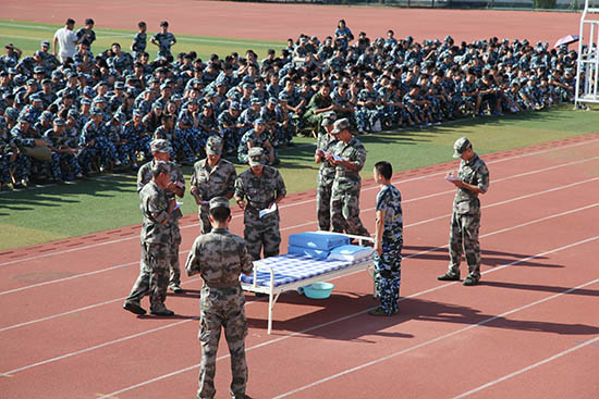 9月10日下午,2014级新生军训内务比赛在奎文校区体育场举行。军训团领导、团委学生工作处负责同志、各二级学院负责同志、辅导员(班主任)及2014级新生观看了比赛。