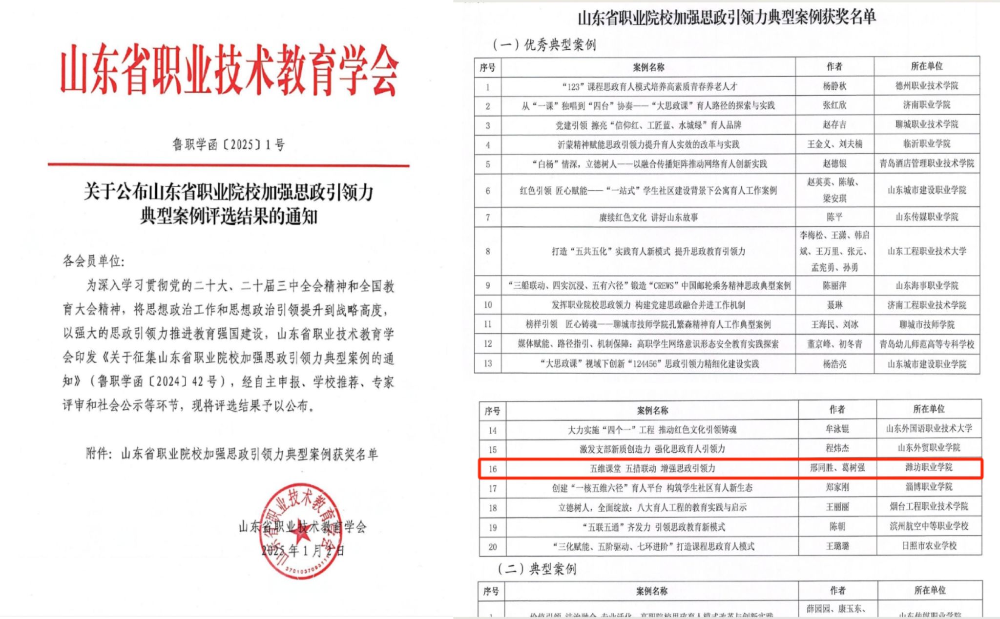 为学习贯彻党的二十大、二十届三中全会精神和全国教育大会精神,将思想政治工作和思想政治引领提升到战略高度,以强大思政引领力推进教育强国建设,山东省职业技术教育学会牵头,党建工作委员会组织,全省职业院校积极参与,经自主申报、学校推荐、专家评审、社会公示等环节,最终评选出优秀典型案例20项、典型案例30项。