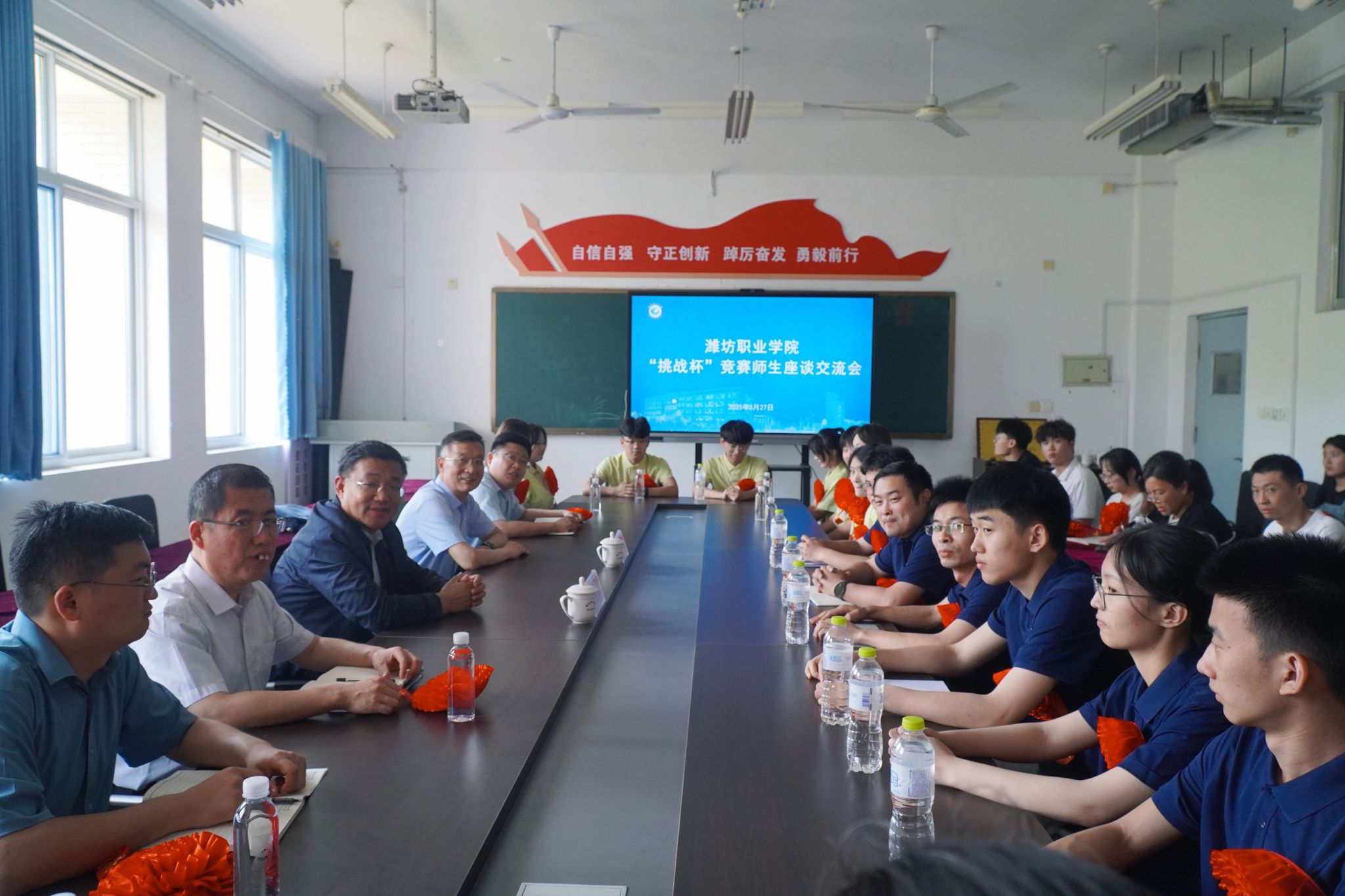 韩瑞东高度肯定了学院在第十九届“挑战杯”山东省大学生课外学术科技作品竞赛中取得的优异成绩,并向获奖团队表示祝贺。他向参赛团队提出三点希望:一是通过比赛,实现以赛促学、以赛促教、以赛促创,全面培育大学生创新意识,营造浓厚的创新创业氛围;二是通过比赛培育全体师生齐心协力、团结一致、吃苦耐劳的精神,全面助力学院“双高建设”和高质量发展;三是做好传承,辐射带动更多师生积极为学院发展建言献策。4个省赛特等奖获奖团队进行交流发言,介绍了参赛备赛情况,分享了参赛收获体会与感受,全方位展示了潍职师生顽强拼搏、昂扬向上、奋发有为的良好精神风貌。