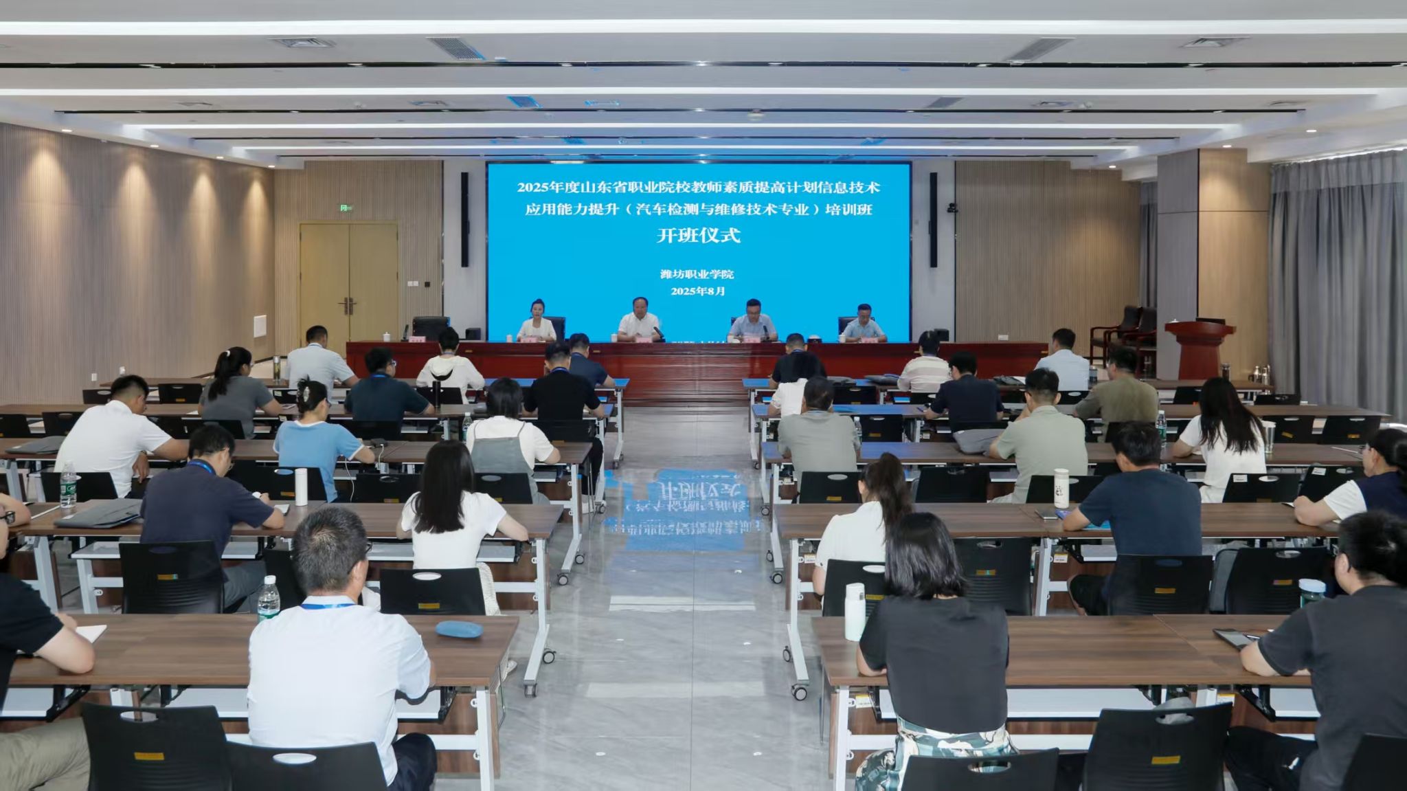 8月12日上午, 2025年度山东省职业院校教师素质提高计划信息技术应用能力提升(汽车检测与维修技术专业)培训开班仪式在学院滨海校区举行。学院党委委员、副院长付一明,党委委员、组织人事处(离退休工作处)处长于涛,教师工作部与汽车工程学院主要负责同志及来自全省高职院校的30名中青年骨干教师参加活动。