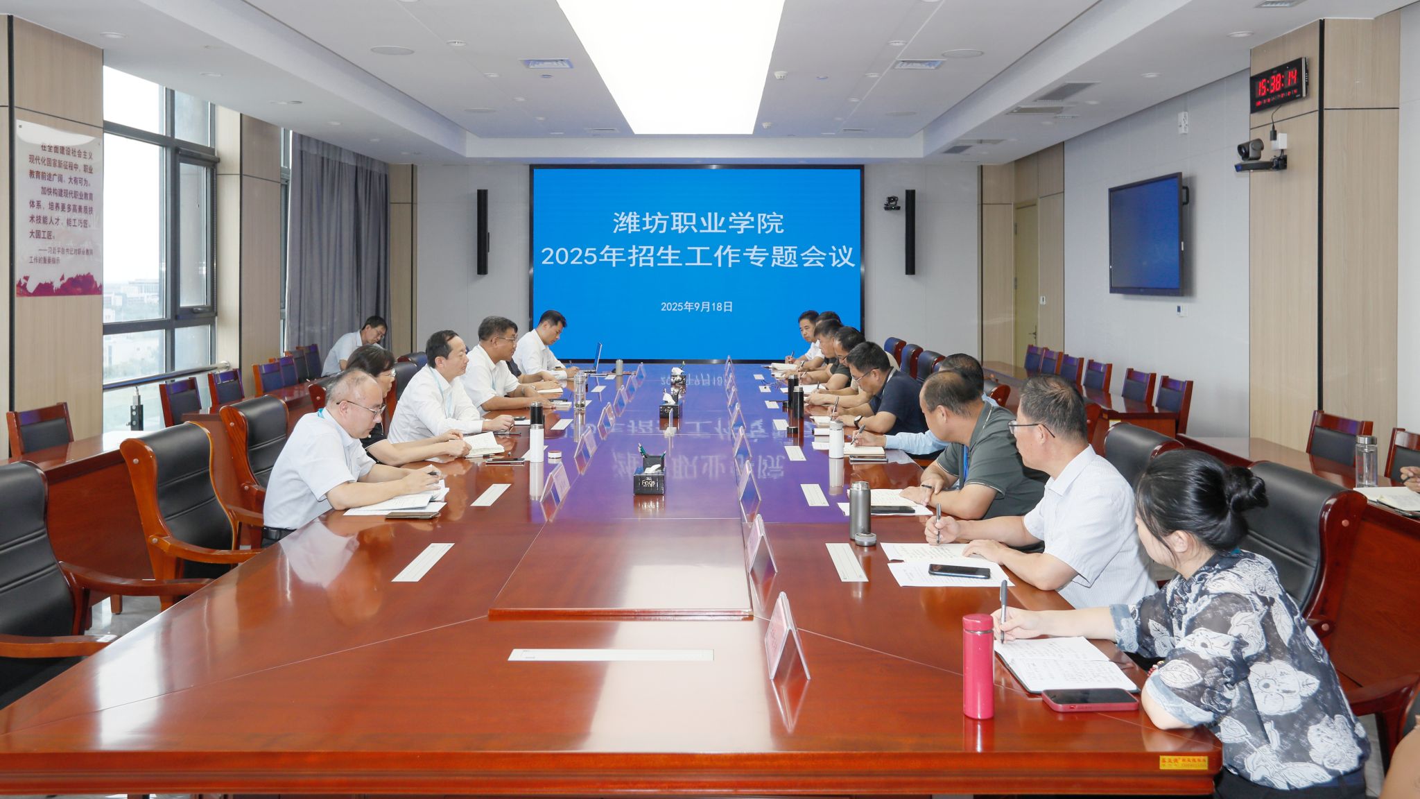 王浩讲话,他充分肯定了2025年招生工作的成绩。他指出,在招生规模扩大背景下,学院各专业招生实现一次性录满,生源质量稳步提升,为学院改革、创新及高质量发展创造了有利条件。他强调,在当前生源竞争激烈、人民群众接受高质量职业教育愿望越来越迫切的背景下,做好今后几年招生工作意义重大。他指出,对照学院“建高升本”目标,对照先进标杆院校,我院需要解放思想、提高站位、认清形势,把招生工作提高到“建高升本”高度,运用系统观念促进问题解决,促进高质量发展。一是以高质量的专业建设促招生。要以适应产业变革和科技革命需求为导向,学习先进经验,加大产业调研,加强专业分析,加快优化调整。二是以高质量的就业工作促招生。要加强校企合作冠名班、订单班人才培养,深化职业生涯规划教育和就业指导,创新开展访企拓岗,加强毕业生就业跟踪及校友服务,促进“招生—培养—就业”良性循环;三是以精准宣传促招生。创新宣传矩阵模式,讲好潍职产教融合特色故事;四是以内涵发展为根基,强化“双师型”师资建设,提升人才培养质量;五是以机制创新促招生,构建全员参与、全程跟进的招生工作新格局。