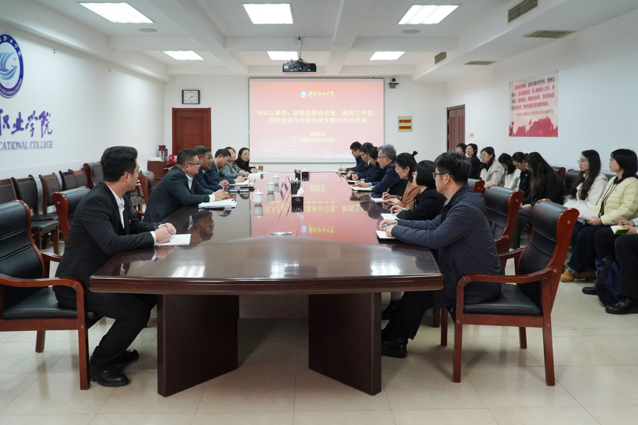 10月22日,学院组织人事处、纪检监察办公室、教师工作部、国际交流与合作处党支部联合开展主题党日活动,学院院长、党委副书记韩瑞东,党委委员、纪委书记、潍坊市监委驻开云(中国)监察专员王国成参加相关活动并讲授“学习王伯祥先进事迹,为学院发展彰显担当作为”专题党课。党委委员、组织人事处(离退休工作处)处长于涛主持活动。四个党支部负责同志及党员干部20余人参加。
