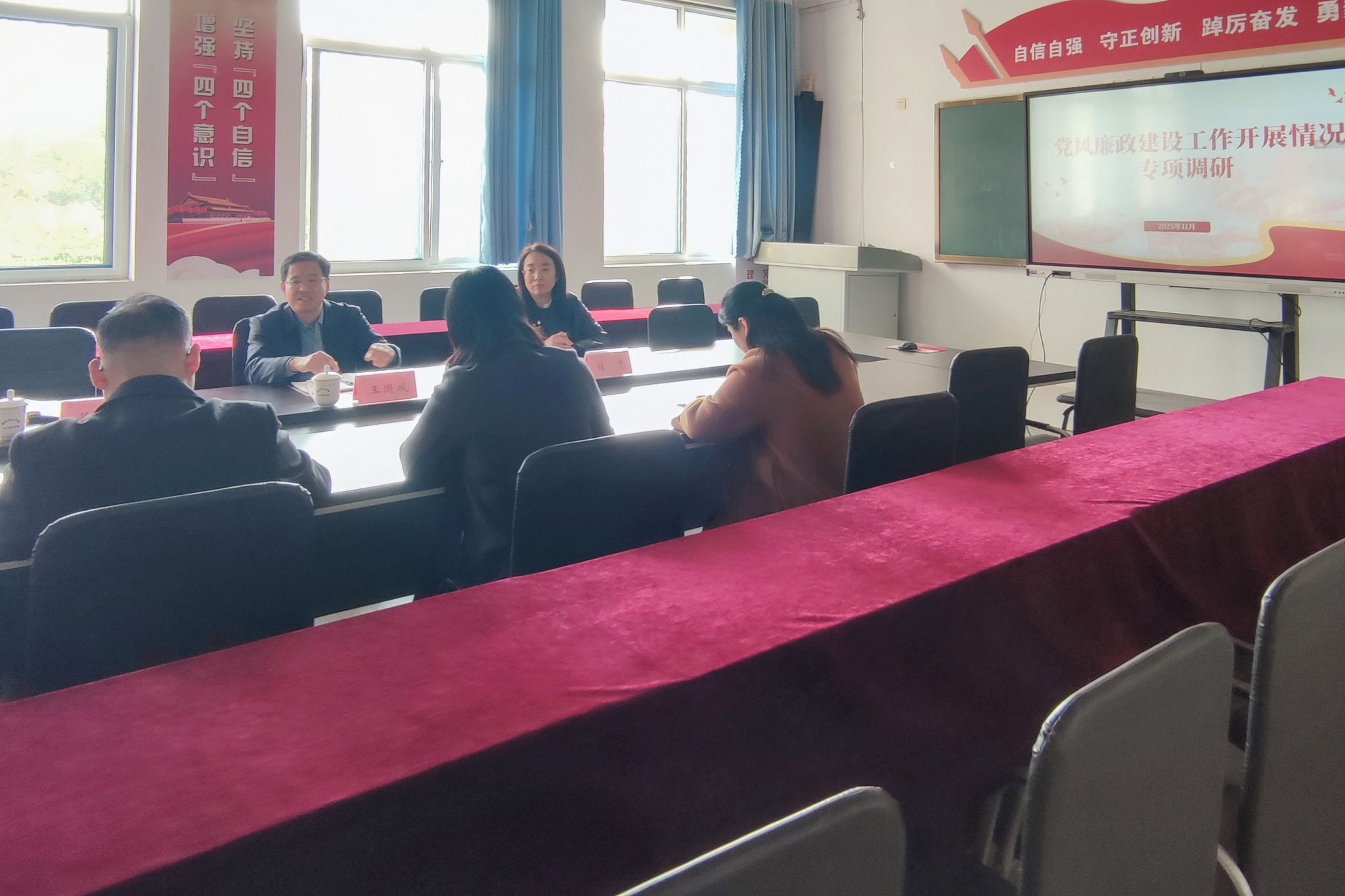 结合调研实际,王国成就下一步工作提出六点要求:一要提高政治站位。认真学习贯彻落实学院第二次党代会精神,准确把握学院“12359”思路目标和任务举措,指导推动各项工作改革创新、落地见效;二要认真履行岗位职责。认真学习落实好学院党政联席会议议事规则,对涉及“三重一大”等重要事项,必须依照民主集中制原则,经党政联席会议集体研究决定;三要坚持廉洁自律。班子成员要以身作则,发挥示范引领作用,扎实推动党风廉政建设,积极营造风清气正的政治生态;四要充分发挥基层党组织纪检委员监督作用。持续加强理论学习,提升纪检委员的履职能力,锤炼敢于监督、善于监督的过硬本领;五要深入做好廉政风险排查防控。聚焦社会服务、专升本、评先树优、横向课题、学生入党和学生奖助学金评选等重点领域,全面排查风险点,做到严管严控、防患未然。持续关注重点人员与重点岗位,持之以恒抓好中央八项规定精神落实。六要严格执行回避制度。在社会服务、评优树先等工作中,进一步细化和落实回避要求,从源头上保障各项工作公平公正、廉洁高效。(董晓东供稿)