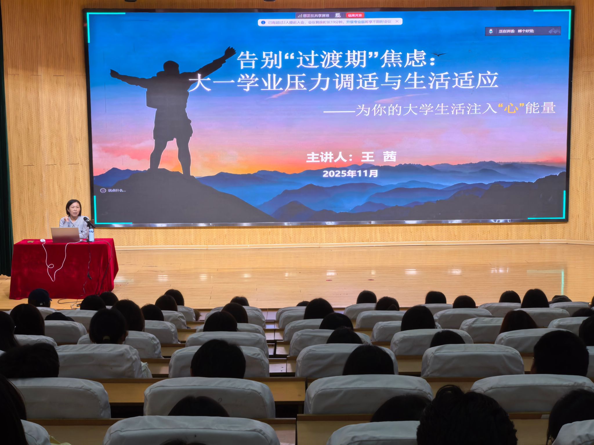 讲座由文化创意学院团总支书记、辅导员办公室主任王茜老师主讲,王老师以《告别“过渡期”焦虑——大一学业压力调适与生活适应》为题,从“人生‘断奶’与成长跃迁”切入,引导新生正确看待大一过渡期的焦虑情绪。她通过“拆开焦虑盲盒”互动小游戏,为同学们梳理出学业适应、人际建立、生活管理三大高频焦虑方向,让新生感受到焦虑的普遍性,增强群体归属感。随后,王老师系统拆解了新生焦虑的核心来源,并澄清“焦虑是大脑预警机制,适度焦虑能激发动力”的认知误区。