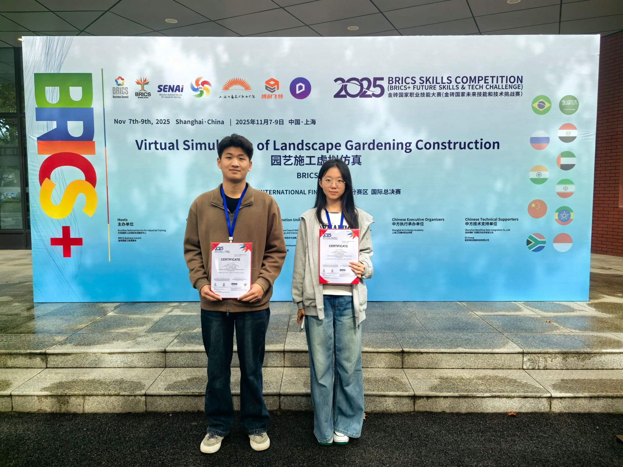 近日,2025 金砖国家职业技能大赛园艺施工虚拟仿真赛项国际总决赛在上海工艺美术职业学院圆满落幕。我院农林科技学院王士通、张一诺组成的参赛队,凭借扎实的专业功底、出色的实操能力和默契的团队协作,从众多参赛队伍中脱颖而出,荣获大赛一等奖,指导老师高洁、管虹获评 “国际优秀指导专家”。