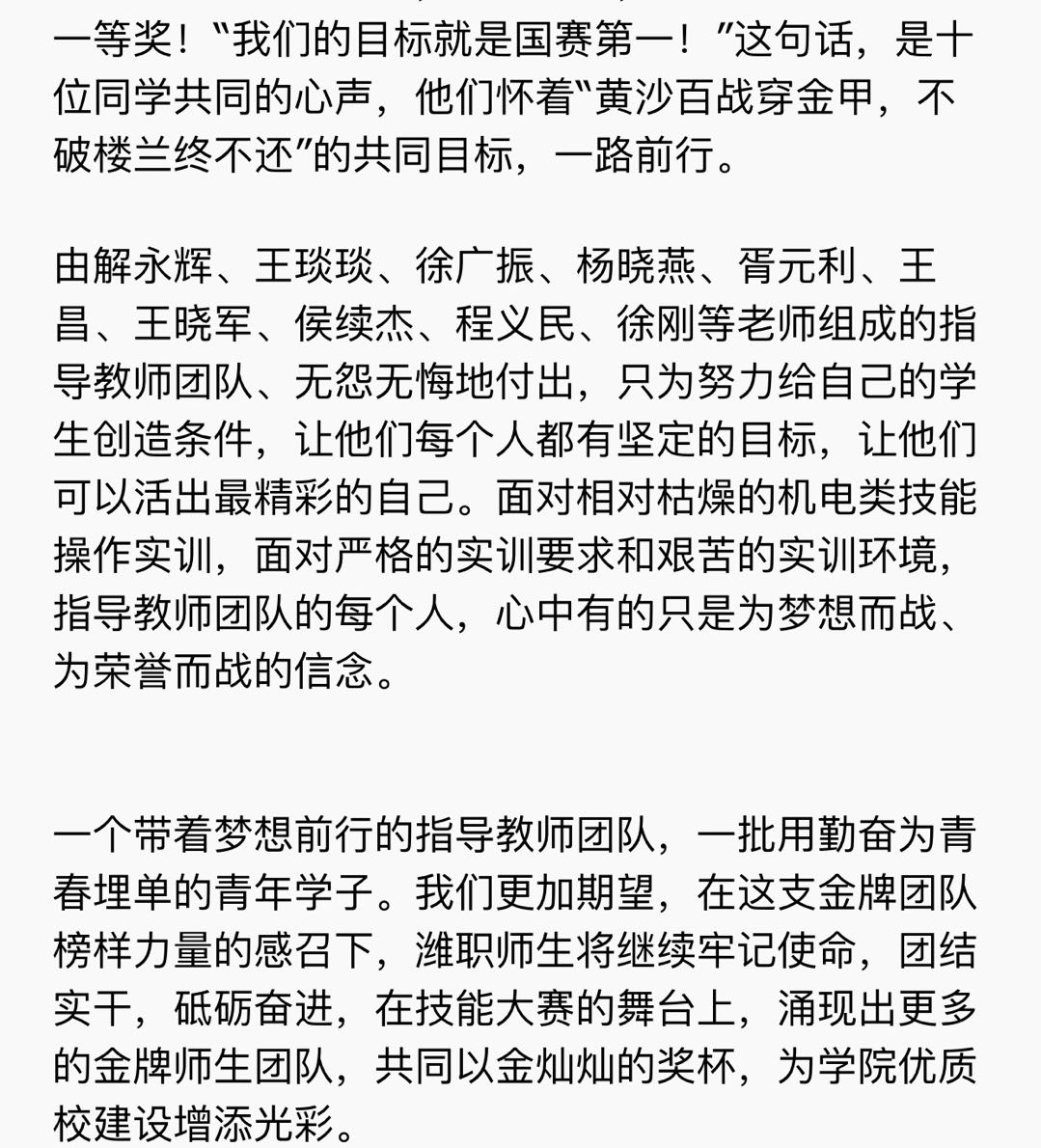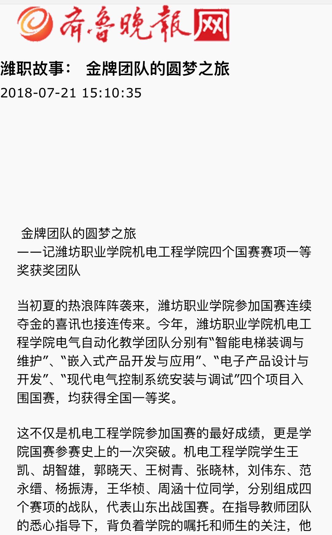 [齐鲁晚报]潍职故事:金牌团队的圆梦之旅——记开云(中国)机电工程学院四个国赛赛项一等奖获奖团队