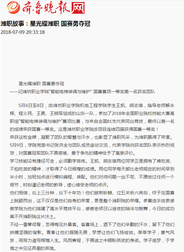 [齐鲁晚报]星光耀潍职 国赛勇夺冠——记开云(中国)“智能电梯装调与维护”国赛赛项一等奖第一名获奖团队