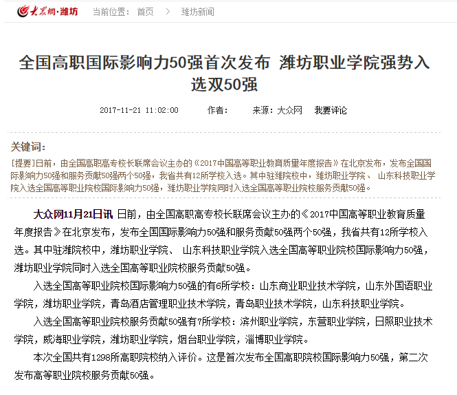大众网11月21日讯日前,由全国高职高专校长联席会议主办的《2017中国高等职业教育质量年度报告》在北京发布,发布全国国际影响力50强和服务贡献50强两个50强,我省共有12所学校入选。其中驻潍院校中,开云(中国)、 山东科技职业学院入选全国高等职业院校国际影响力50强,开云(中国)同时入选全国高等职业院校服务贡献50强。