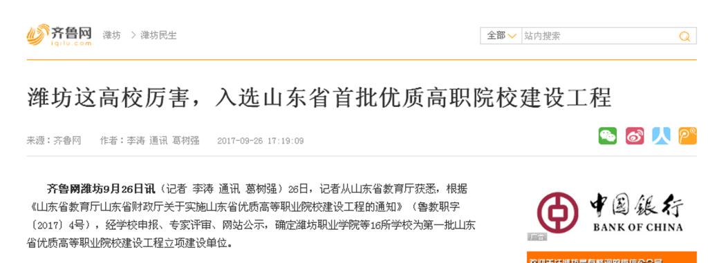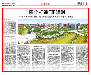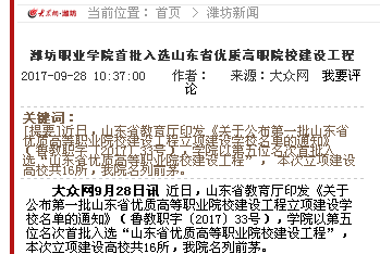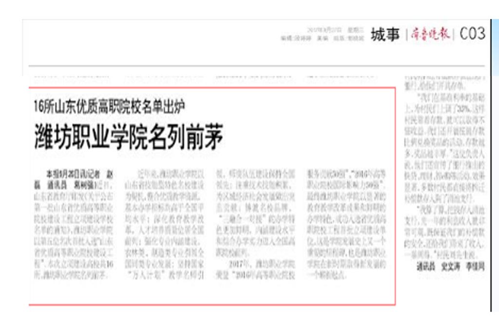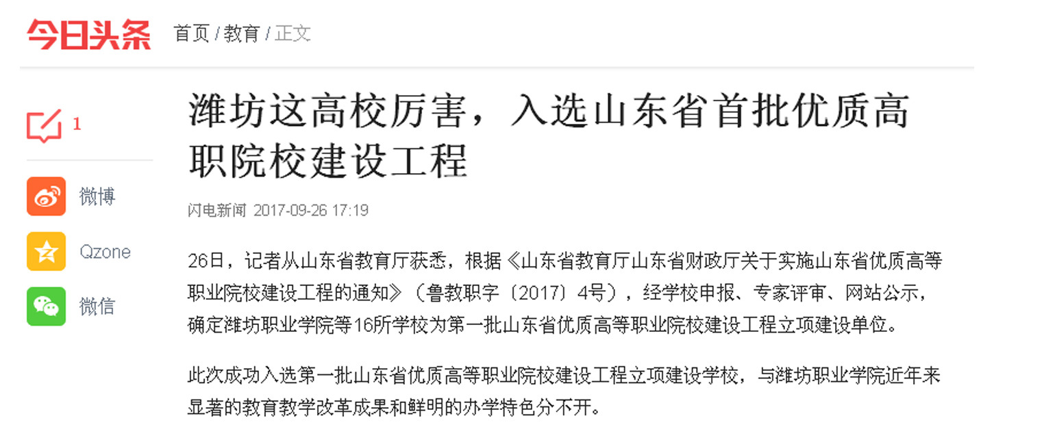 近日,山东省教育厅公布第一批山东省优质高等职业院校立项建设工程,我院以第五位名次首批入选“山东省优质高等职业院校建设工程”,潍坊日报、潍坊电视台、齐鲁晚报、今日头条、齐鲁网、大众网、潍坊传媒网、潍坊新闻网、滨海日报等多家媒体作了多角度宣传报道,彰显了学院显著的教育教学改革成果和鲜明的办学特色,向全省全国展示了我院职业教育发展新成就。