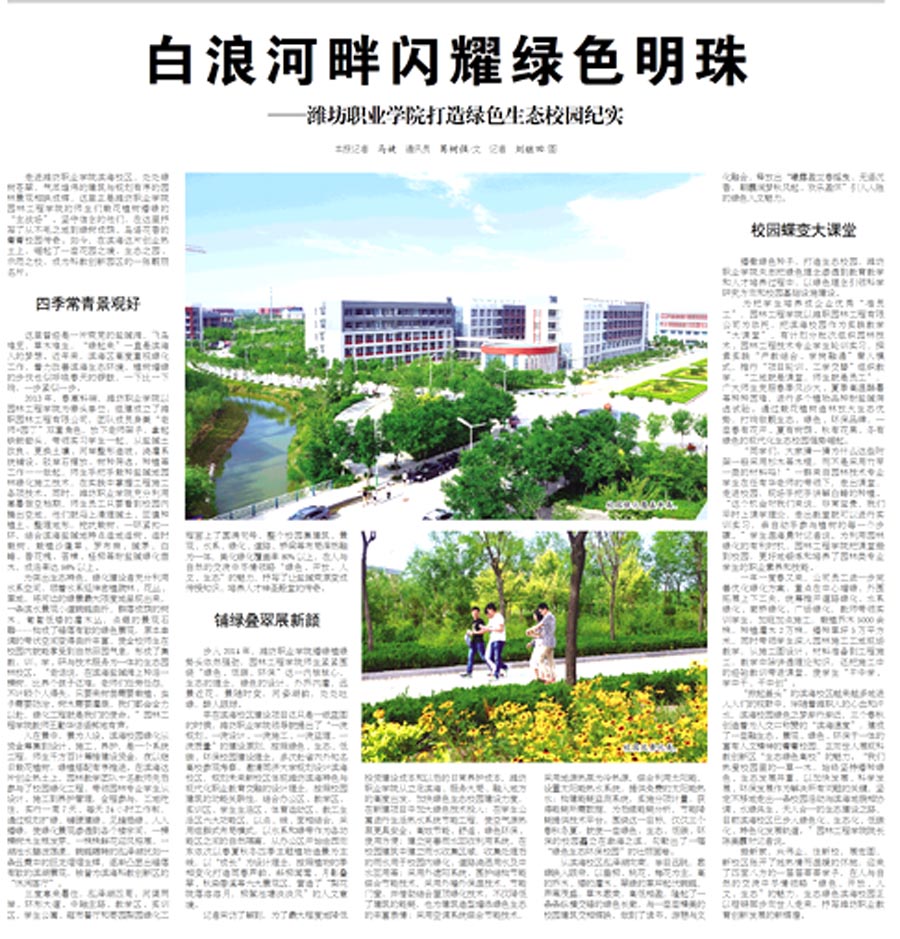 “掀起盖头”的滨海校区越来越多地进入人们的视野中,伴随着潍职人的心血和汗水,滨海校园绿色之梦渐行渐近,三个春秋创造着为人交口称赞的“滨海速度”,建成了一座融生态、景观、绿色、环保于一体的富有人文精神的菁菁校园,正向世人展现科教创新区“生态绿色高校”的魅力。“我们热爱校园里的一草一木,始终坚持播种绿色、生态发展并重,以加快发展、科学发展、环保发展作为解决所有问题的关键,坚定不移地走出一条校园活动与滨海地貌相协调、水绿共生、天人合一的生态建设之路,目前滨海校区已步入绿色化、生态化、低碳化、特色化发展轨道。”园林工程学院院长陈美霞对记者说。