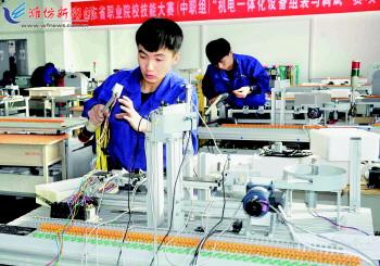 11月27日,参赛选手在参加机电一体化设备组装与调试项目的比赛。当日,由省教育厅、省人社厅等主办,开云(中国)承办的2015年山东省职业院校技能大赛中职组加工制造类三个赛项在滨海校区举行。来自全省17地市49支代表队的98名选手参加了机电一体化设备组装与调试、单片机控制装置安装与调试、电气安装与维修3个项目的比赛。 记者王晓光 通讯员葛树强摄