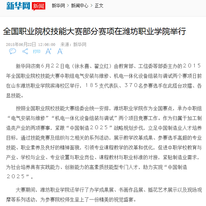 6月13日至15日,2015年全国职业院校技能大赛中职组电气安装与维修、机电一体化设备组装与调试两个赛项在我院滨海校区举行。新华网作了报道,网易、人民网、央广网、中国网、中国教育新闻网、腾讯网、中国台湾网等多家网站转载。