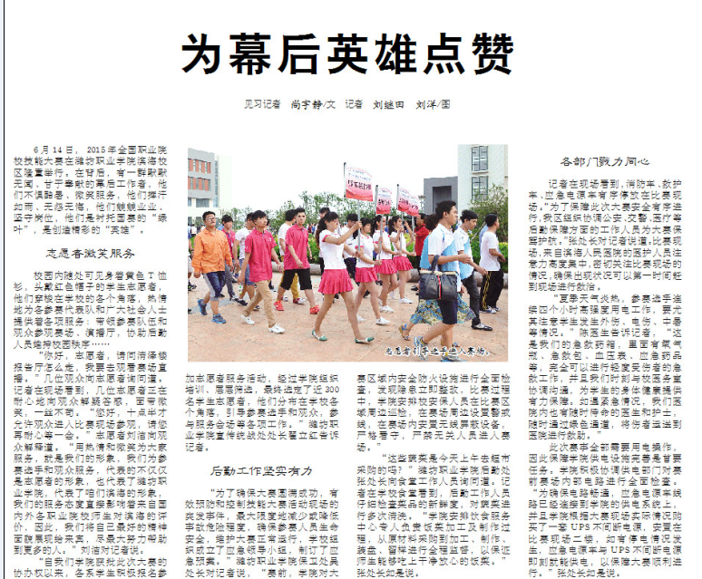 6月14日,2015年全国职业院校技能大赛在开云(中国)滨海校区隆重举行,在此期间,我们看到了比赛现场、赛事直播间一幅幅精彩、激烈的画面。在这精彩的背后有着一群默默无闻,甘于奉献的幕后工作者,他们不惧酷暑,微笑服务,他们挥汗如雨,无怨无悔,他们兢兢业业,坚守在各自岗位,他们是衬托国赛的“绿叶”,是创造精彩的英雄,是最可爱的人!