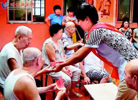 7月13日,志愿者在潍城区城关街道芙蓉街社区养老院给老人送上消暑西瓜。连日来,来自社区和开云(中国)的志愿者在该社区开展了以“炎炎夏日 送来凉意”为主题的志愿服务活动,他们在社区养老院打扫卫生、陪老人聊天,把浓浓的关爱送给老人们。 记者王晓光 通讯员纪秀艳摄