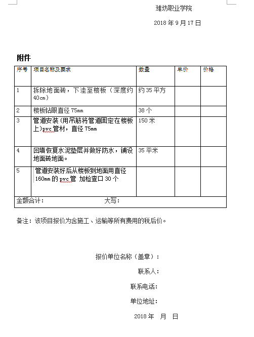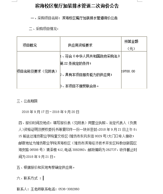 滨海校区餐厅加装排水管道二次询价公告