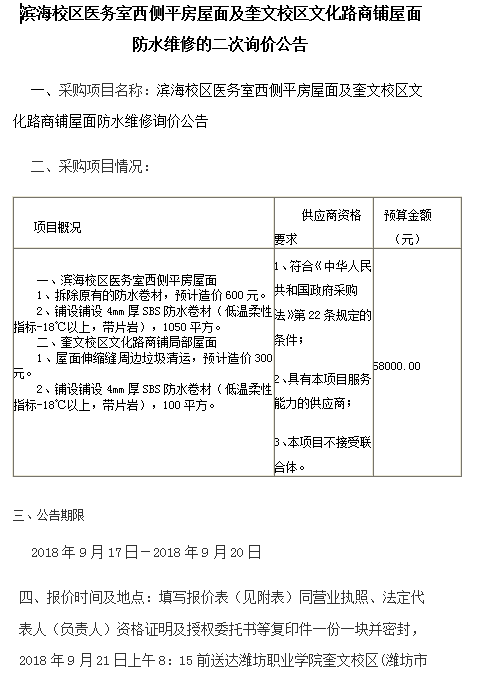 滨海校区医务室西侧平房屋面及奎文校区文化路商铺屋面防水维修的二次询价公告