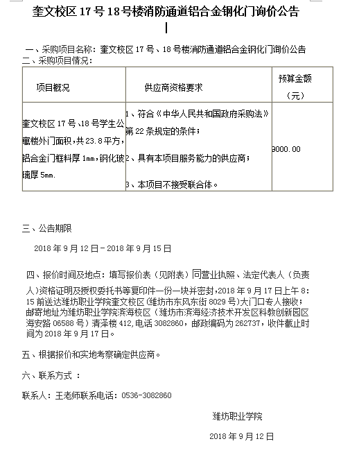 奎文校区17号18号楼消防通道铝合金钢化门询价公告