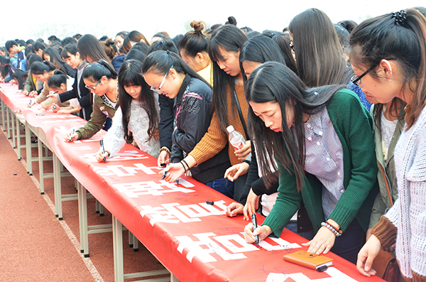 仪式结束后,经营管理学院全体学生纷纷签名表达勤学报国的决心。(王婷婷供稿)