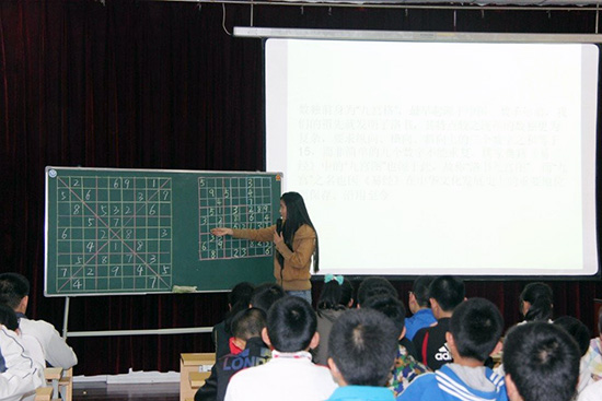 聂玉秀同学上台讲解了数独的发展历史和世界锦标赛的情况,介绍了数独游戏的规则和答题方法,并且准备了一道简单的标准数独题目现场和中学生一起互动作答。在座的学生答题的积极性很高,有一位学生兴奋地到黑板前说明他答题的思路和方法。白静同学介绍了“对角线数独”和“杀手数独”等较为复杂的数度题目,更引起了新华中学师生的浓厚兴趣。
