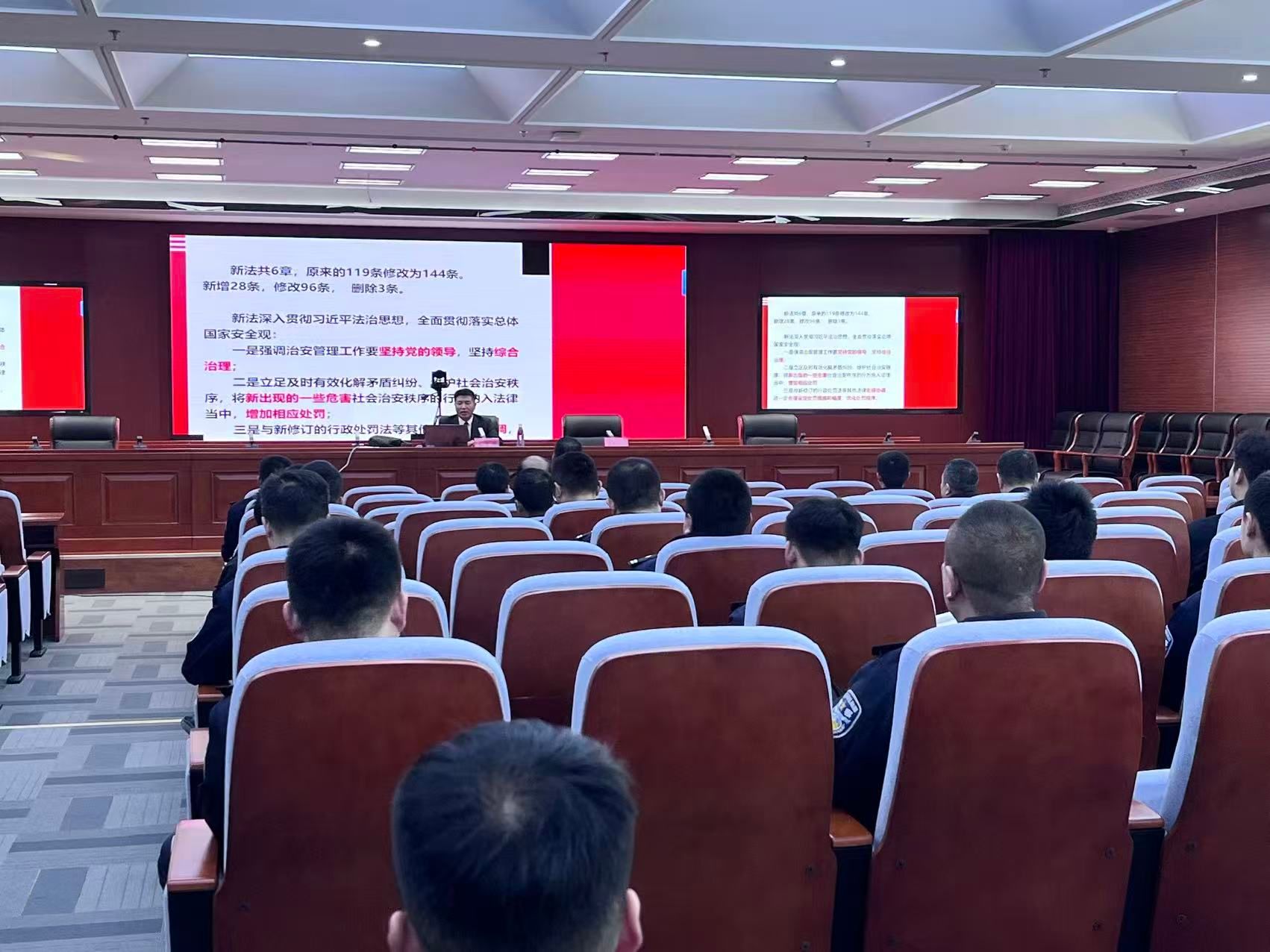 宣讲中,孙天锋凭借深厚的专业知识,紧密结合案例,讲解了新治安管理处罚法修改的背景、原则、修订要点、《中华人民共和国治安管理处罚法》新旧条款对照等内容,清晰阐释了法律修订的时代必要性与现实意义。针对干警关注的执法重点难点,孙天锋聚焦法律修订的五大核心要点展开深入讲解。在新旧条款对照部分,孙天锋以表格形式直观呈现法律修订细节,并结合防城港亮证女事件等典型案例,剖析条款修订背后的法治精神,帮助干警精准把握法律适用尺度。培训过程中,干警们认真记录、积极互动。现场氛围热烈,培训效果显著。