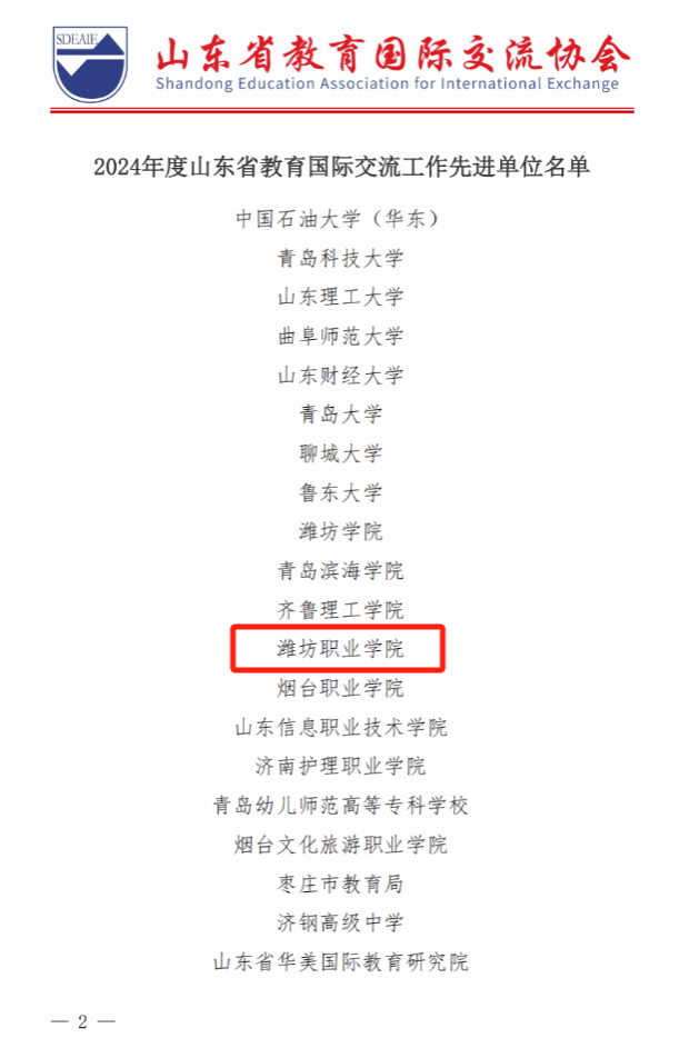 近日,山东省教育国际交流协会发布了《关于表彰2024年度山东省教育国际交流工作先进单位、先进个人的决定》,我院荣获“2024年度山东省教育国际交流工作先进单位”称号。