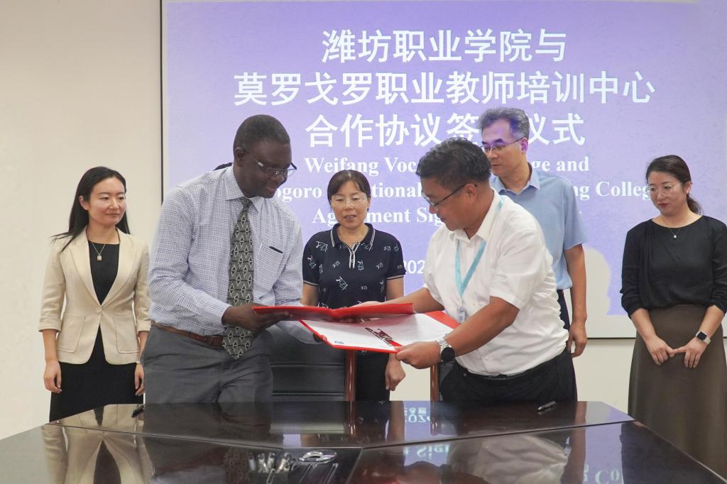 会后,莫罗戈罗职业教师培训中心校长萨姆韦尔·阿龙·卡利访问我院,学院党委副书记韩瑞东、副院长陈美霞在奎文校区接待客人,国际交流与合作处主要负责同志参加座谈交流。两校互相介绍了学校概况、办学规模、专业设置等情况,并观看两校宣传片。经过友好洽谈,增进了两校互信,明确了校际合作意愿,并签署了友好交流协议,就开展教师短期培训、师生互访等领域达成共识。
