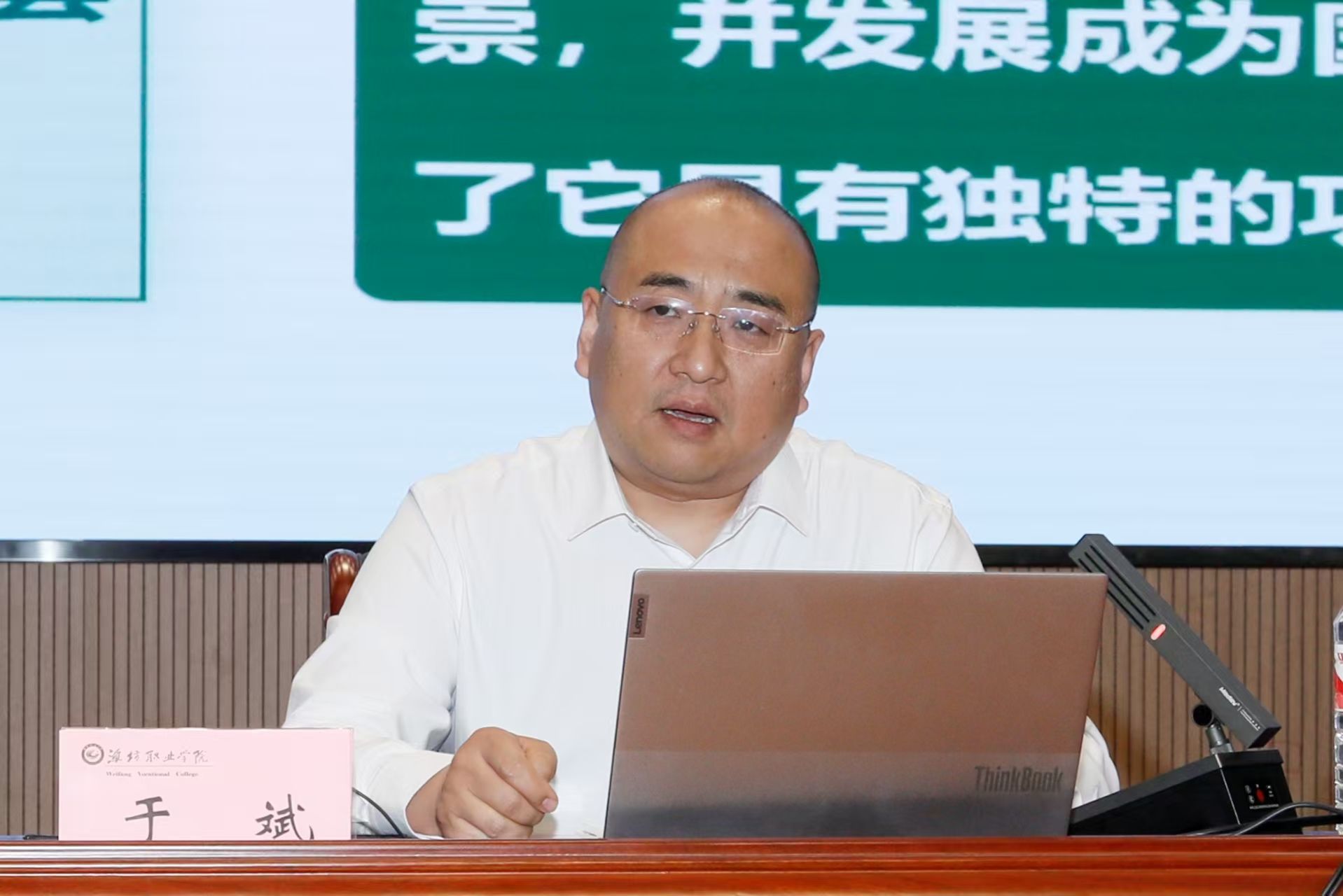付一明主持并讲话。他对张荣军和于斌两位产业教授的到来表示诚挚欢迎和衷心感谢,表示职业教育与产业发展同频共振是时代赋予的使命,也是学院服务区域经济发展、培养高素质技术技能人才的重要举措。他对全体教师提出殷切希望,一要做“产教融合”的践行者,让教学扎根产业土壤;二要做“匠人精神”的传承者,培养更多“德技并修”的能工巧匠;三要做“校企共赢”的推动者,主动对接企业需求,将技术攻关转化为教学资源,让科研成果服务区域发展。
