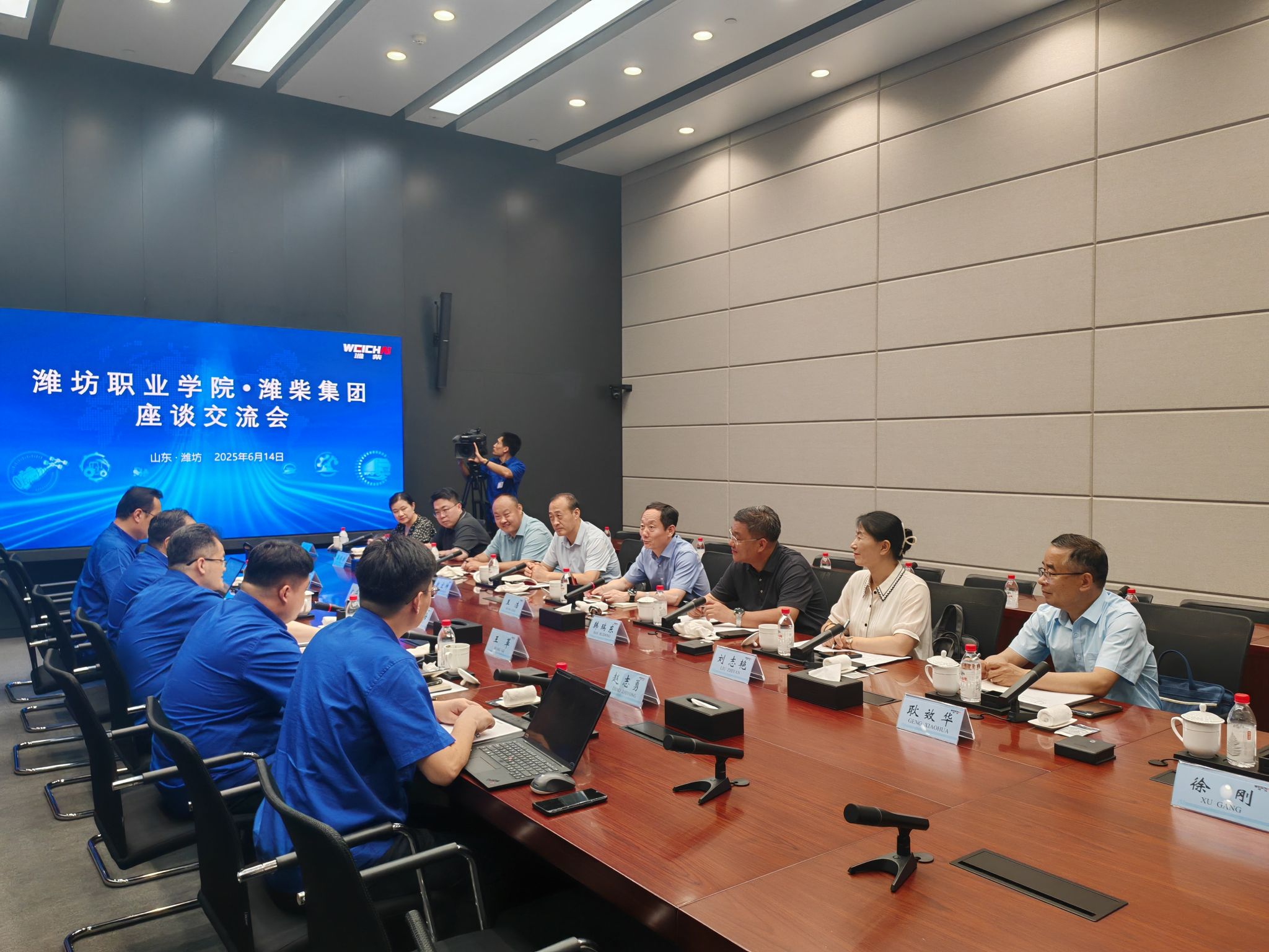 王浩详细介绍了学院的基本情况、办学特色和发展规划,并对双方合作取得的成效表示赞赏。他强调,学院将充分发挥职业教育优势,进一步深化与潍柴集团的战略合作,在产教融合机制优化、双师互聘、职教出海等方面积极探索,推动校企合作向更高水平迈进。与会人员围绕创新人才培养模式、师资共享、技术研发等议题展开深入讨论,达成多项共识。