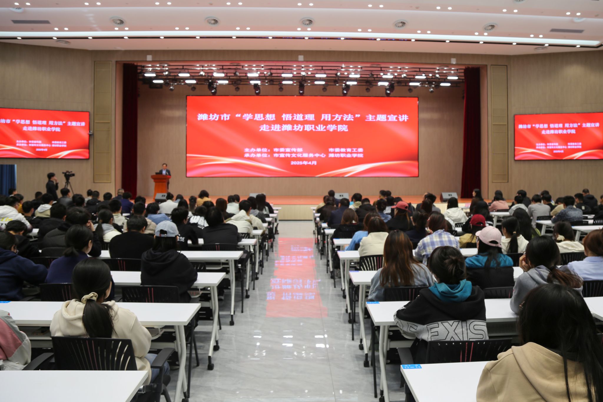 4月11日下午,潍坊市“学思想 悟道理 用方法”主题宣讲进高校活动在学院顺利举行。潍坊市委宣传部副部长白钢、学院党委书记王浩、潍坊市宣传文化服务中心副主任王海军、潍坊市宣传文化服务中心理论宣讲科科长董莉娜等出席活动。学院相关部门负责人、二级学院师生代表共380人参加活动。