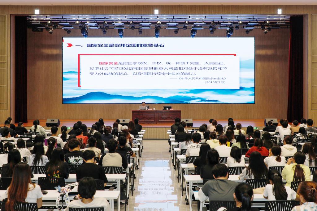 陈美霞从保证国家安全是头等大事、当前我国国家安全形势、贯彻总体国家安全观和公民责任与参与四个方面同大家进行交流。首先,她回顾了总体国家安全观的历史,通过俄乌战争和巴以冲突等现实案例的讲述,强调了国家安全内涵丰富,国家安全是安邦定国的重要基石、是民族复兴的根基,为社会发展提供条件和保障。其次,面对新形势下我国国家安全和社会安定面临的威胁和挑战,她指出,习近平总书记提出当前我国国家安全内涵和外延比历史上任何时候都要丰富,时空领域比历史上任何时候都要宽广,内外因素比历史上任何时候都要复杂。她强调,我们要安而不忘危,存而不忘亡,治而不忘乱,谨记保证国家安全是头等大事。随后,她探讨了中国如何维护和塑造国家安全的一系列基本问题。她指出,进入新时代,我国国家安全形势发生重大变化,面对新挑战新问题,以习近平同志为核心的党中央创造性提出总体国家安全观,从全面和战略高度对国家安全作出一系列重大决策部署,开创维护国家安全的崭新局面。最后,陈美霞激励食品药品学子,作为新时代大学生需信念坚定,增强国家安全意识,守护国家安全,践行青春使命。
